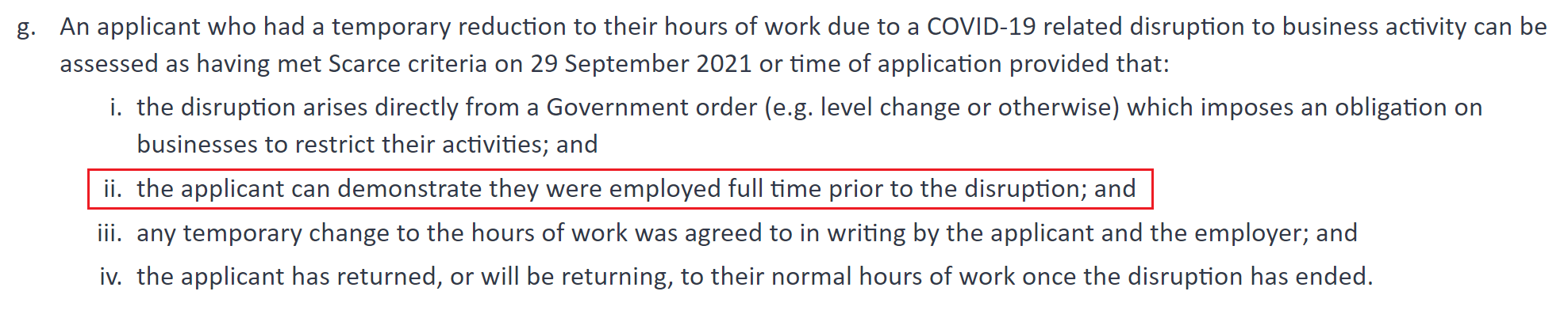Normally, under Scarce, you need to show you were employed in 'scarce' role on a full time basis on 29/09/2021. But if you were on wage subsidy on that date, you will need to show you were in full time employment before the period of disruption had started: