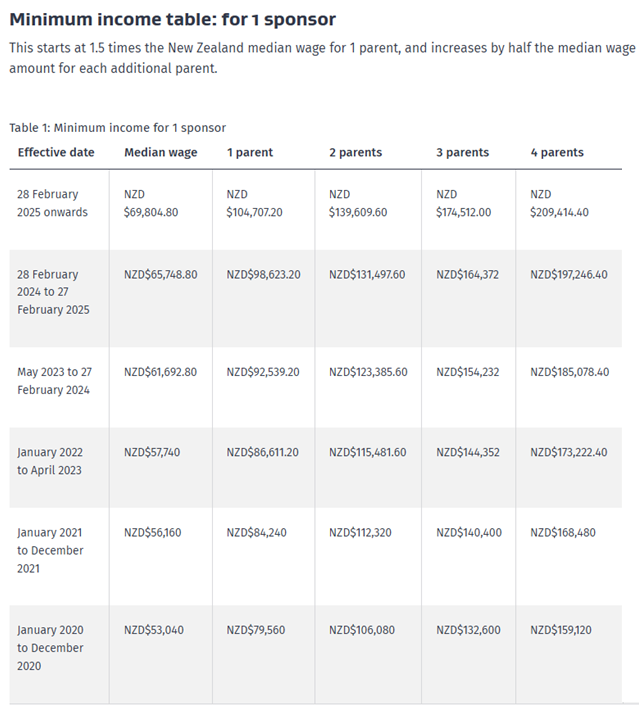 From 28 February 2025, income thresholds for sponsors under the Parent Category were indexed to the new median wage of NZD $33.56 an hour.